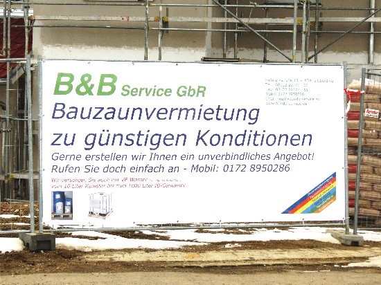 Mit einem Bauzaun stehen Ihnen alle Möglichkeiten der Abgrenzung, bzw. des Sichtschutzes offen. Überwiegend werden Bauzäune zur Absicherung von Baustellen und/oder Baumaschinen verwendet. Darüber hinaus finden sie oft aber auch Einsatz auf Messen oder Veranstaltungen (z. B. als Abgrenzung des Catering auf einer Messe). Zusätzlich können Sie hier einen Sichtschutz anbringen (mit oder ohne Werbung). Mietpreise für Werbeflächen auf Anfrage.